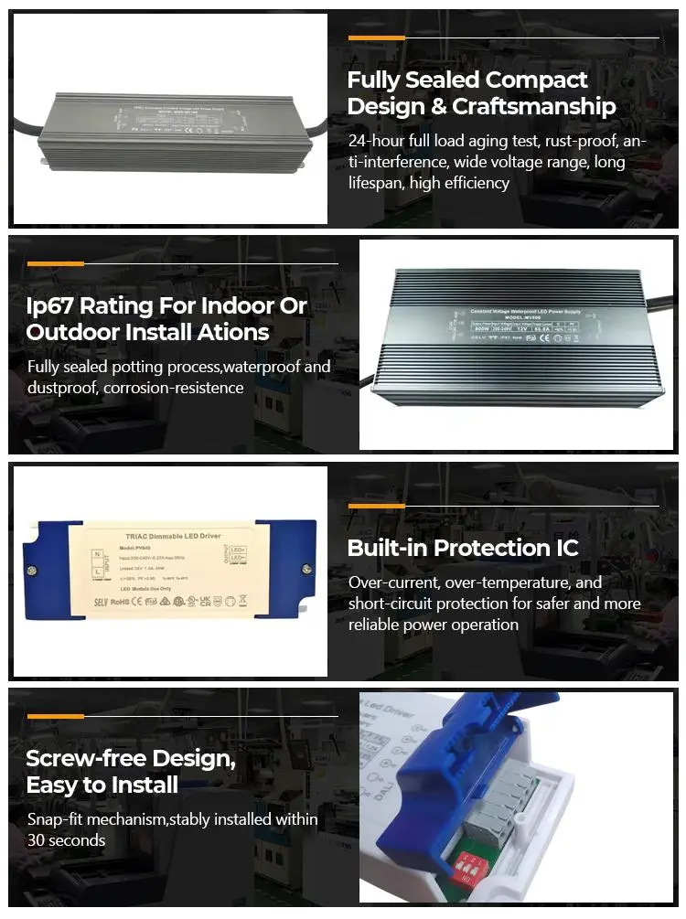High-level Waterproof at Full-scenario Compatibility: IP67 waterproof standard, na sinamahan ng waterproof potting + one-piece molding sealing technology, walang leakage sa loob ng 30 minuto sa 1 metro sa ilalim ng tubig, na may ganap na waterproof, moisture-proof at dust-proof na antas; Tugma sa 10-40W LED fixtures sa masalimuot at malupit na panlabas, ilalim ng tubig at iba pang kapaligiran, na may saklaw na temperatura sa paligid na -20℃~60℃.