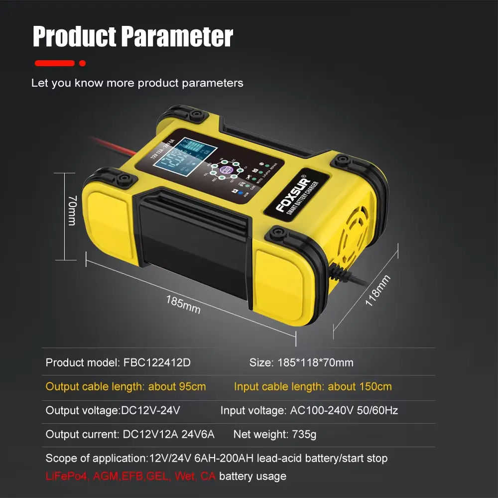 • Mga uri ng baterya: Karamihan sa mga uri ng lead acid na baterya kabilang ang Calcium, Gel AGM, LiFePo4, Wet, lead Acid, atbp.