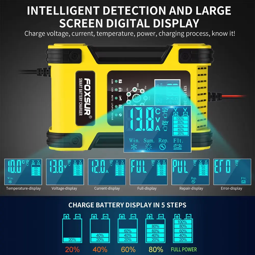 • Ito ay isang ganap na awtomatikong charger ng baterya na may 7 yugto ng pag-charge.