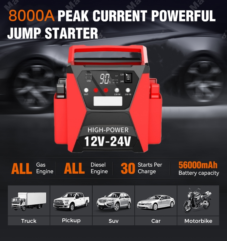 Ipinakilala ng STARWELL ang high-performance nitong 12V/24V Car Jump Starter Intelligent Battery Charger, isang game-changer para sa mga may-ari ng sasakyan na naghahanap ng pagiging maaasahan at katalinuhan sa pagpapanatili ng baterya at pagsisimula ng emergency. Nilagyan ng 8000A peak current at 4000A start current, ang dual-voltage intelligent na charger ng baterya na ito ay pinagsasama ang matibay na kapangyarihan sa matalinong teknolohiya, na ginagawa itong angkop para sa lahat ng gas engine at diesel engine hanggang 15L, na sumasaklaw sa mga kotse, trak, RV, motorsiklo, bangka, at kahit na heavy-duty na komersyal na sasakyan.