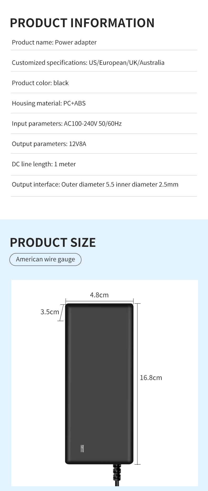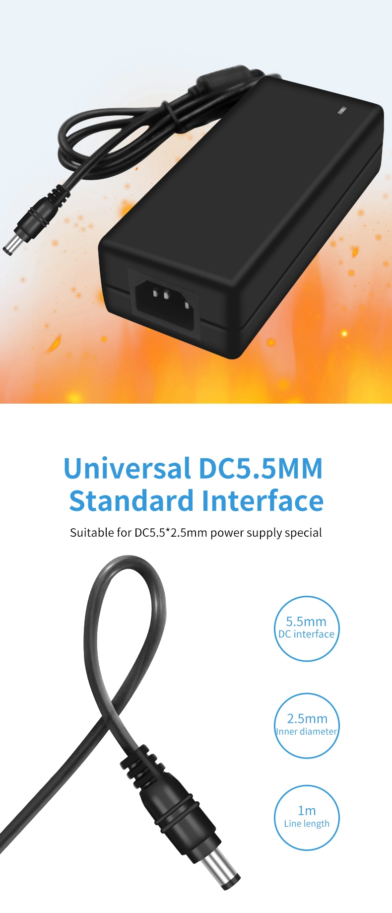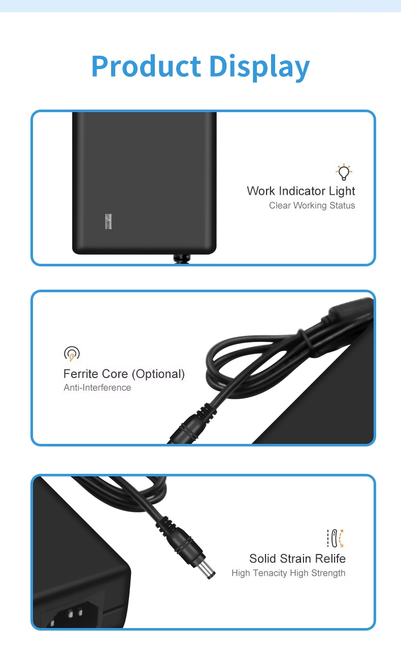 Ang AC 100-240V wide voltage input ay katugma sa mga power grid sa mahigit 100 bansa sa buong mundo. Ang 1.5m extended na output cable (1.0mm² diameter) na ipinares sa isang 180° rotatable DC connector ay umaangkop sa iba't ibang mga sitwasyon sa pag-install. Sa compact size na 120×60×30mm lang, ito ay 35% na mas maliit kaysa sa mga tradisyunal na adapter na may parehong kapangyarihan, na tumitimbang lamang ng 280g—pagpapabuti ng portability ng 50%.
