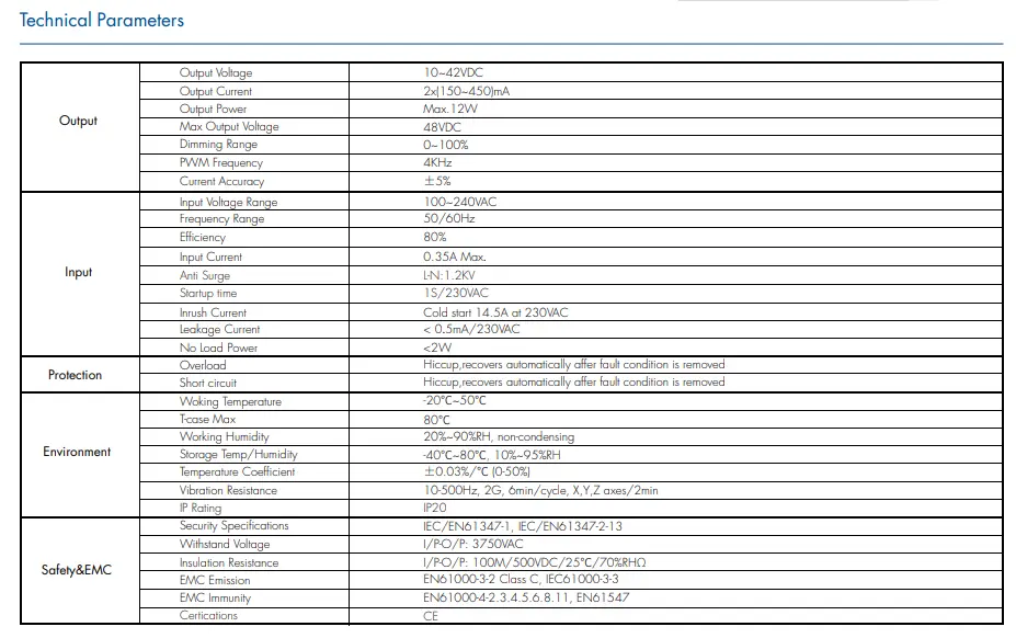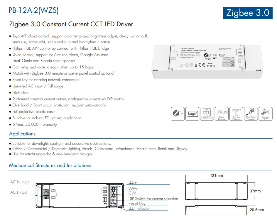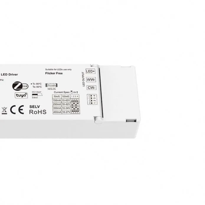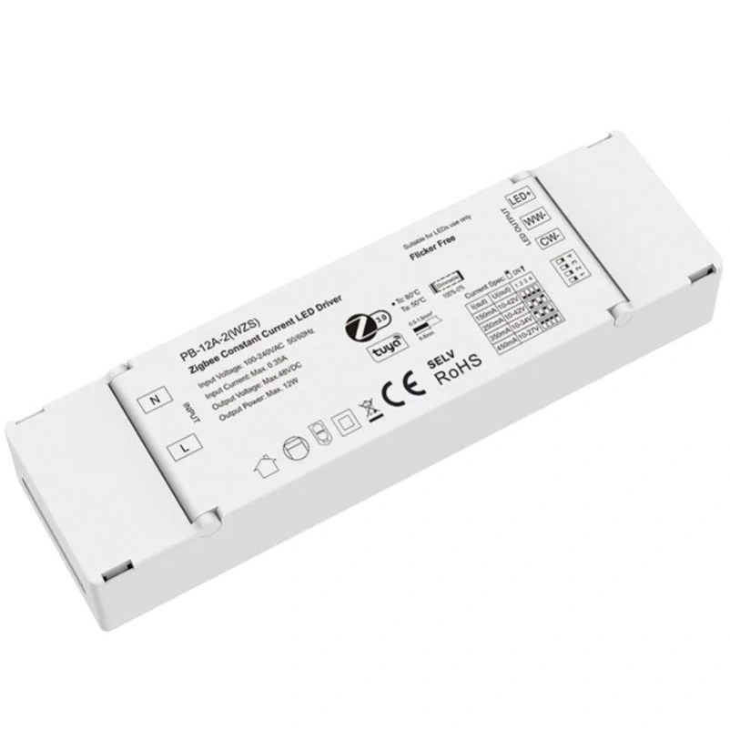 Ang STARWELL factory's CE-certified 12W TUYA Zigbee CCT Dimmable LED Drivers ay high-efficiency smart lighting power solution na idinisenyo para sa modernong residential at commercial lighting system. Sinusuportahan nito ang malawak na boltahe ng input na 100~240VAC 50/60Hz, na nagbibigay-daan sa matatag na global application. Sa may rate na output power na max.12W, napagtanto ng driver na ito ang makinis na kontrol ng CCT dimming batay sa TUYA Zigbee wireless protocol, na nagbibigay-daan sa mga user na isaayos ang parehong liwanag at temperatura ng kulay nang malayuan sa pamamagitan ng APP, voice assistant, at matalinong mga eksena.