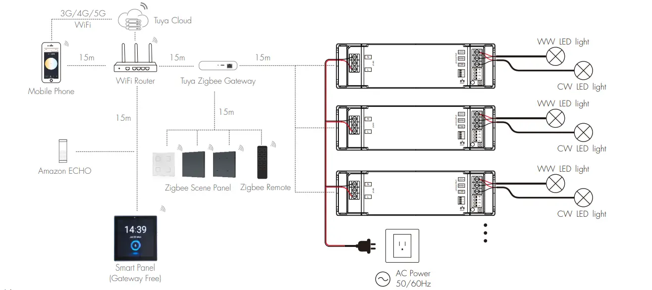 Ganap na sinusuportahan ng TUYA Zigbee LED Driver ang TUYA Zigbee protocol para sa stable na wireless na koneksyon, na nakakakuha ng makinis na Flicker-free CCT at brightness dimming. Sinusuportahan nito ang kontrol ng APP, kontrol ng boses, kontrol ng grupo at mode ng eksena, na nagdadala ng mahusay na kaginhawahan sa mga smart lighting system.