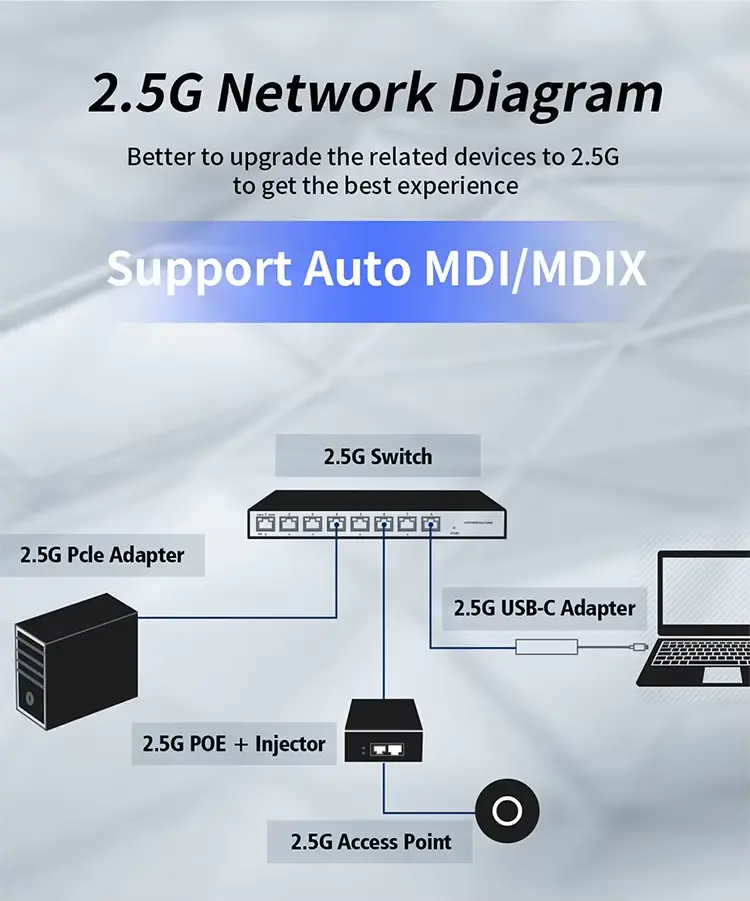 Manatiling nangunguna sa kurba ng bandwidth na may suporta para sa 2.5Gbps na bilis ng data, ganap na pabalik na tugma sa 10/100/1000Mbps na mga device.