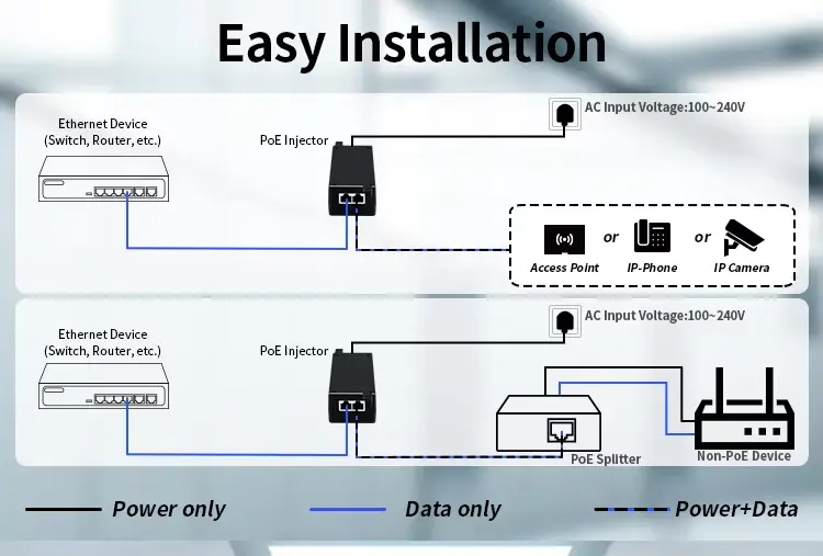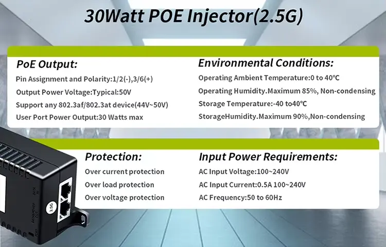 Sinusuportahan ng 30W Poe Injector na ito ang maraming pamantayan ng PoE, na ginagawa itong isang nababaluktot na pagpipilian para sa iba't ibang device.