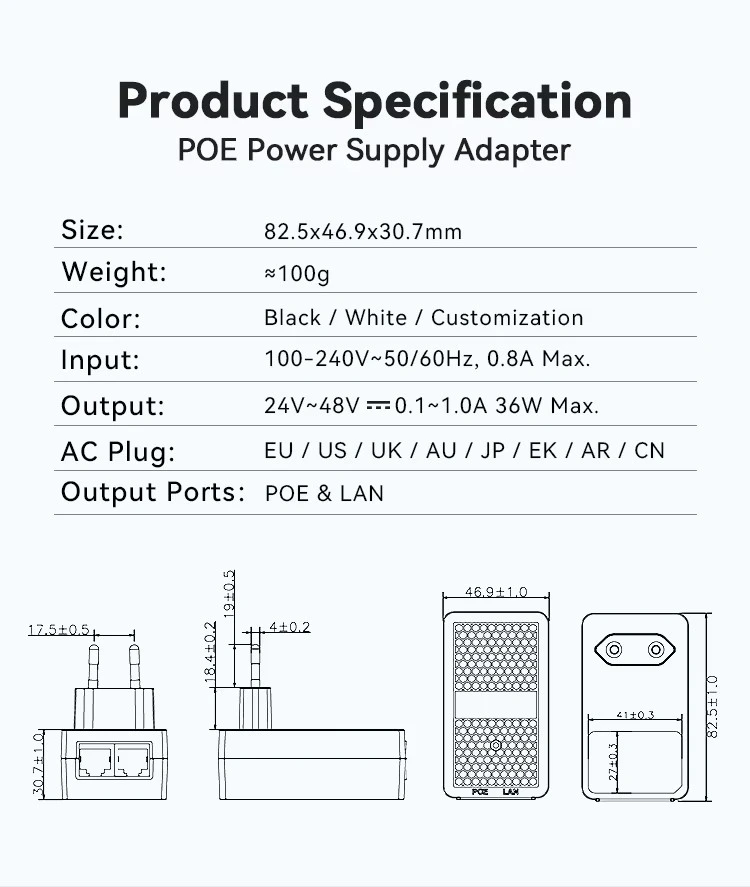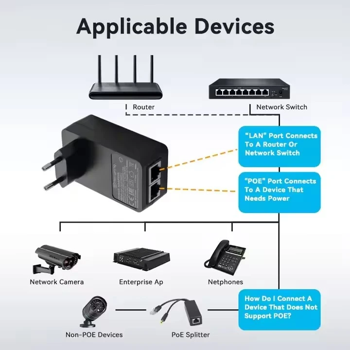 Nagtatampok ang 24V 1A Wall Mounted EU Plug POE Injector ng pabrika ng STARWELL ng 24V 1A na unibersal na AC input (100-240V) na may mga mapipiling output: 24V/0.5A, 24V/1A, o 48V/0.5A. Sinusuportahan nito ang parehong Passive at Active PoE na mga protocol, na may nababaluktot na mga pagtatalaga ng pin kabilang ang Midspan (4,5+/7,8-) at Endspan (1,2+/3,6-). Ganap na sumusunod sa mga pamantayan ng IEEE802.3af/at/bt PoE++, naghahatid ito ng mga pambihirang kakayahan sa bilis ng data mula 10/100/1000M hanggang 2.5G/5G/10G bps.