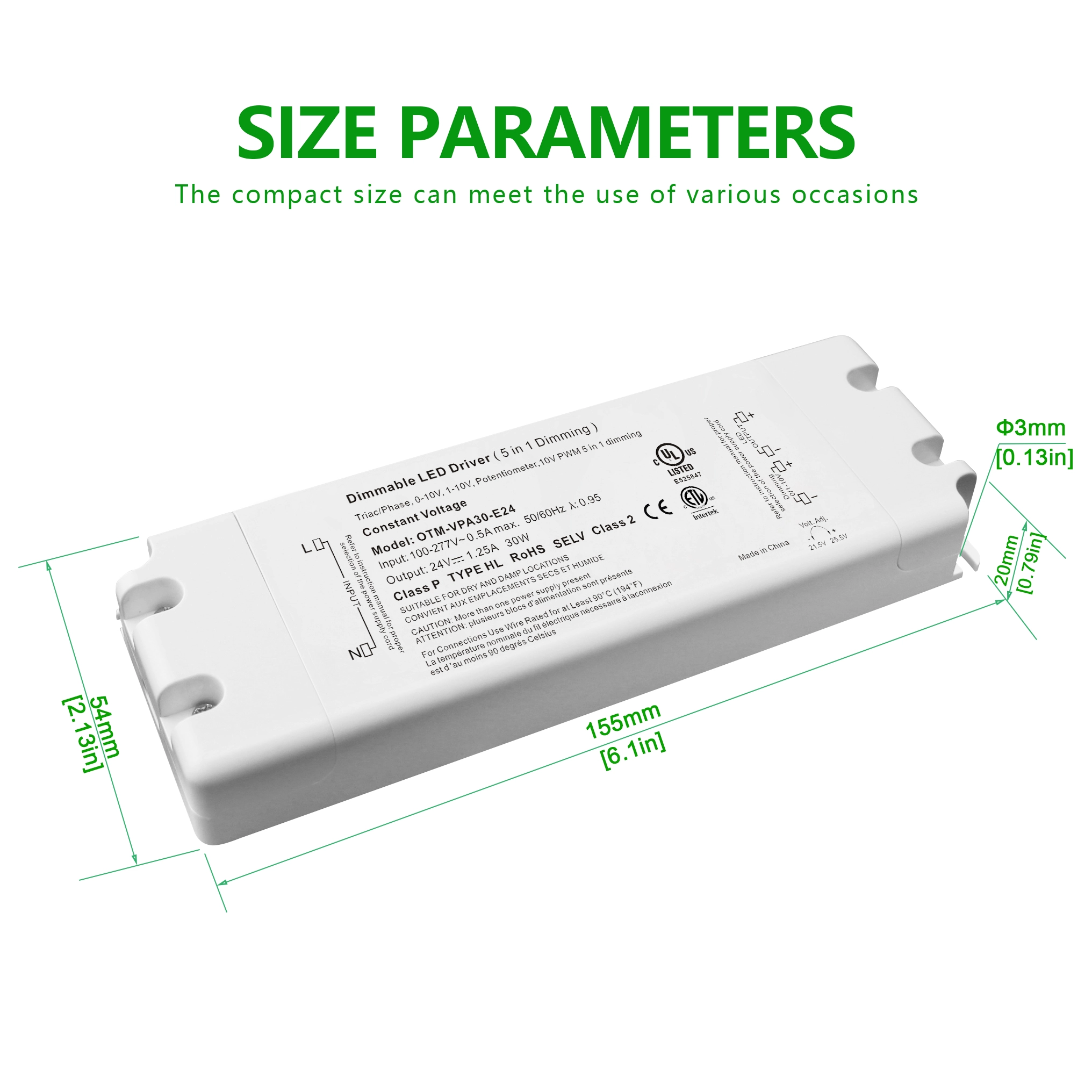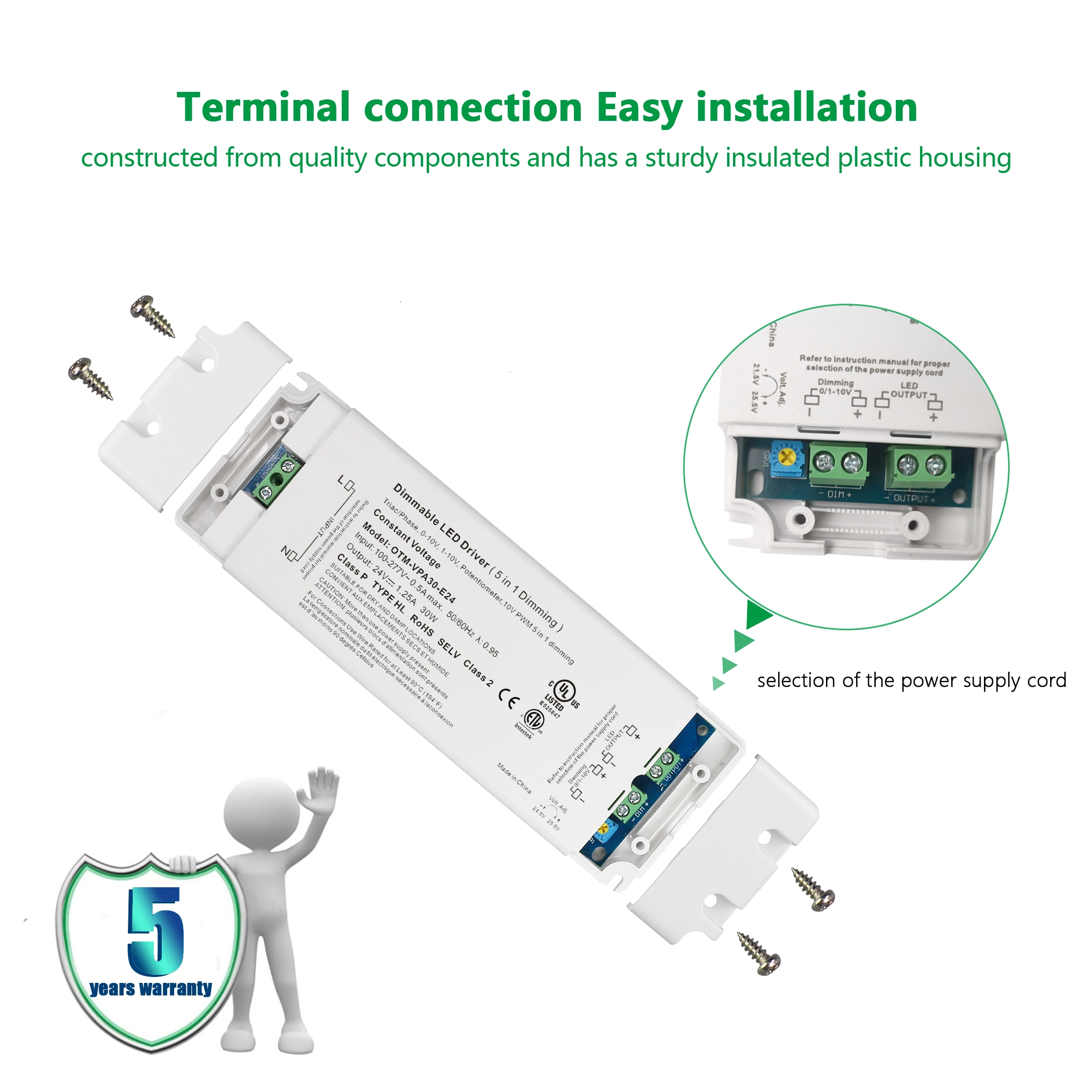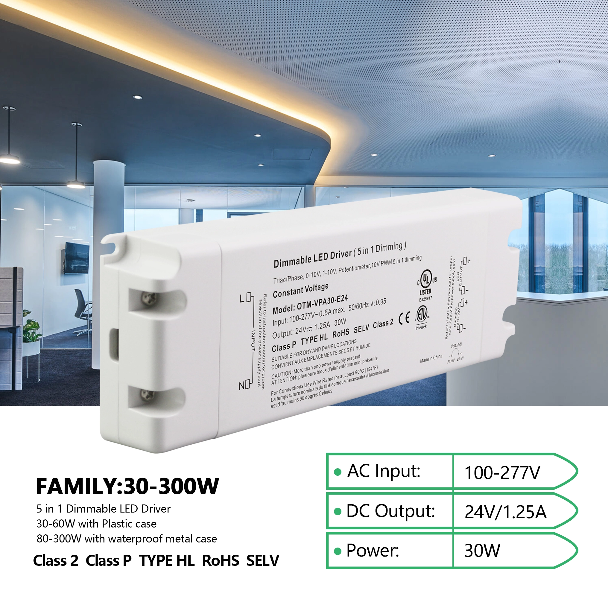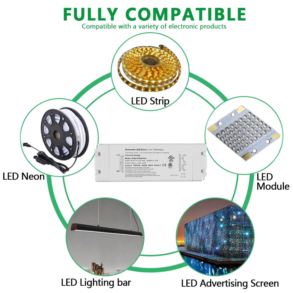 Ang STARWELL factory's classy 24V 30W 0-10V constant voltage dimming LED driver ay maaaring maghatid ng maximum na output power na hanggang 30W at partikular na idinisenyo upang makamit ang tuluy-tuloy na dimming control mula 0 hanggang 10V. Nagtatampok ito ng stable na boltahe na output na may ripple coefficient na ≤ 120mVp-p, na tinitiyak ang pagganap ng pag-iilaw na walang flicker ng mga LED fixture. Malawak ang saklaw ng boltahe ng input nito (100-240V AC, 50/60Hz), na may kahusayan sa conversion na hanggang 88%, na nagpapagana ng operasyong makatipid ng enerhiya. Sumusunod din ito sa mga pandaigdigang pamantayan ng boltahe. Ang 0-10V LED driver na ito ay nilagyan ng iba't ibang mga function ng proteksyon upang matiyak ang maaasahan at ligtas na paggamit sa iba't ibang mga application sa panloob at panlabas na ilaw.