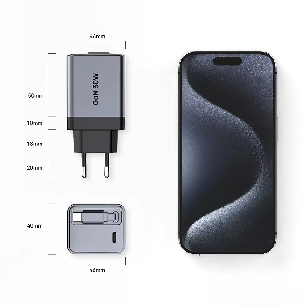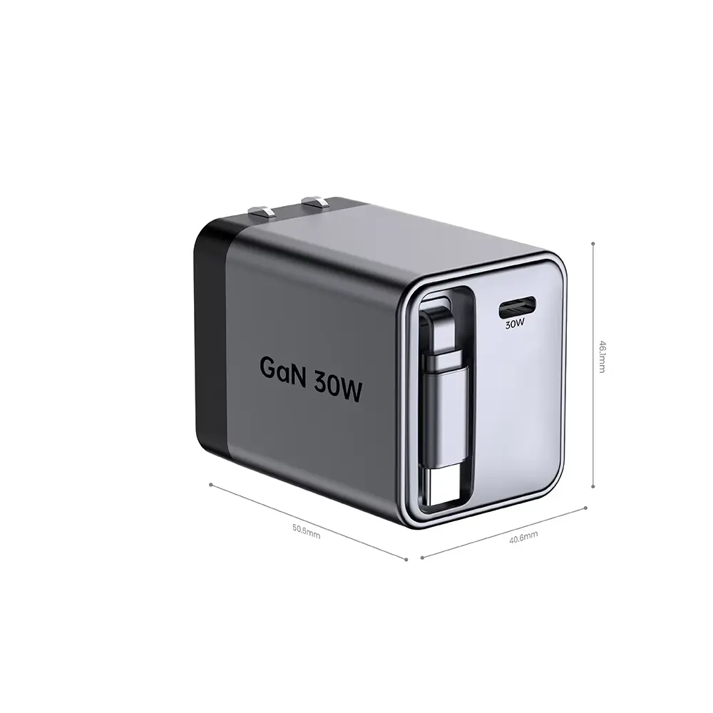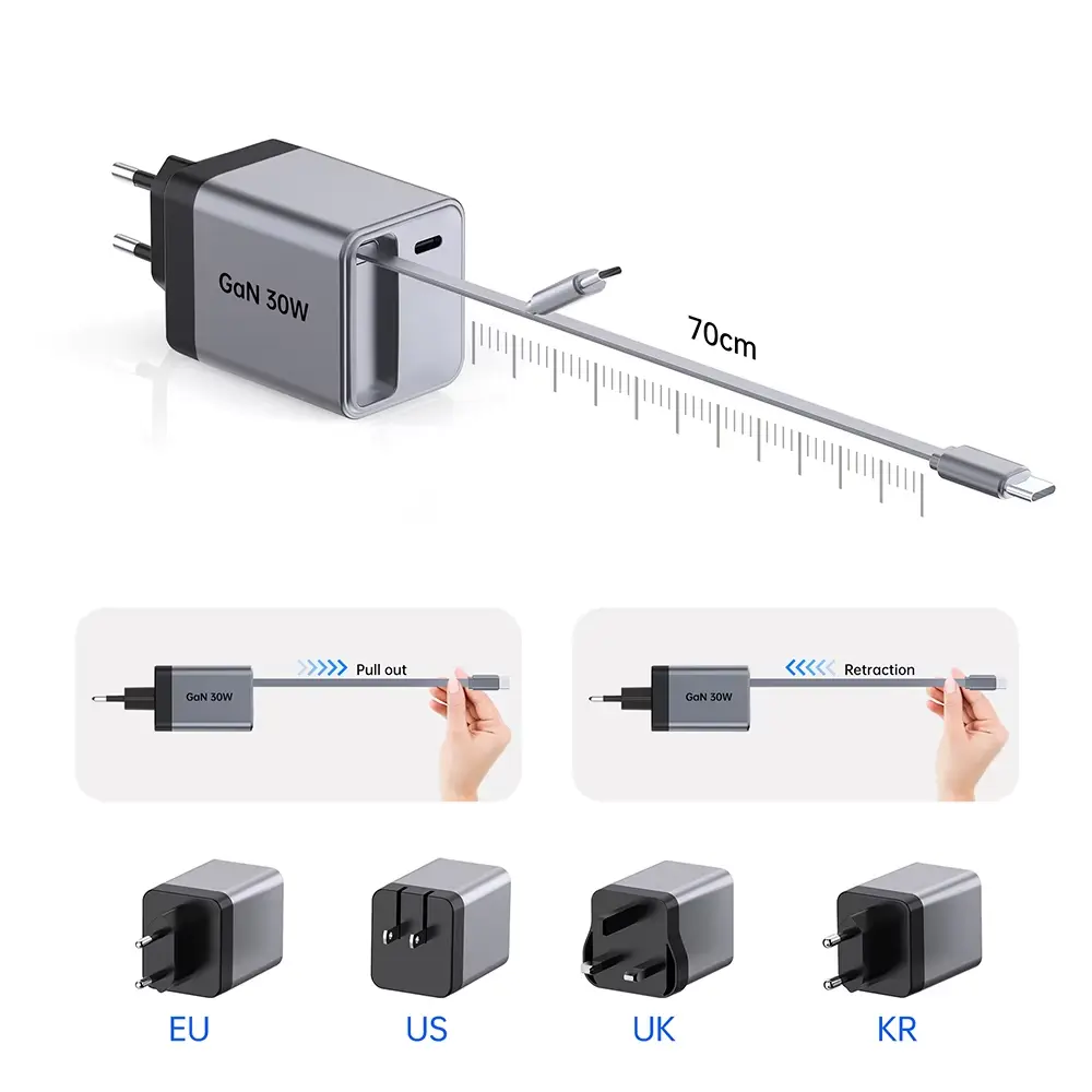 30W Mabilis na Charger na may Retractable Type C Cable's Ultra-lightweight, Pocket-sized na disenyo ay ginagawang madali itong dalhin sa paligid. Ito ang perpektong pagpipilian para sa bahay, opisina, o paglalakbay.