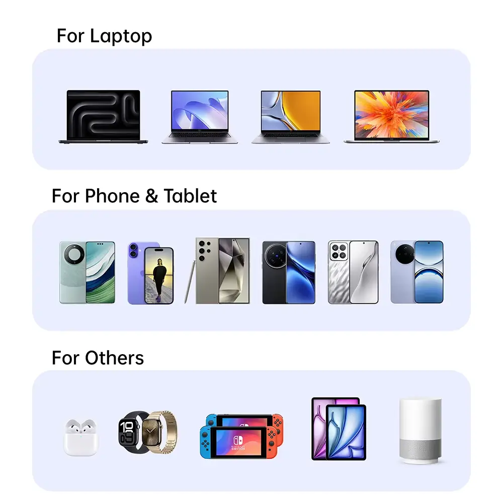 Katugma sa mga aparato ng USB-C, kabilang ang mga mobile phone, headphone, at mga accessories sa paglalaro. Awtomatikong nakita ang mga pangangailangan ng aparato para sa ligtas at mahusay na singilin. 4.Travel-handa na portability