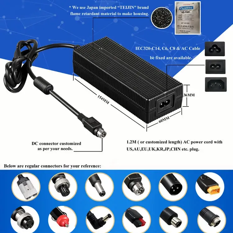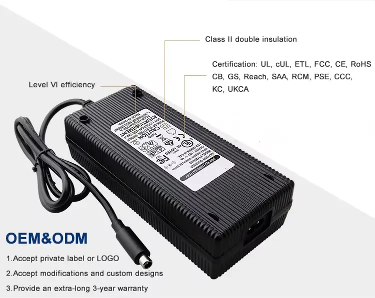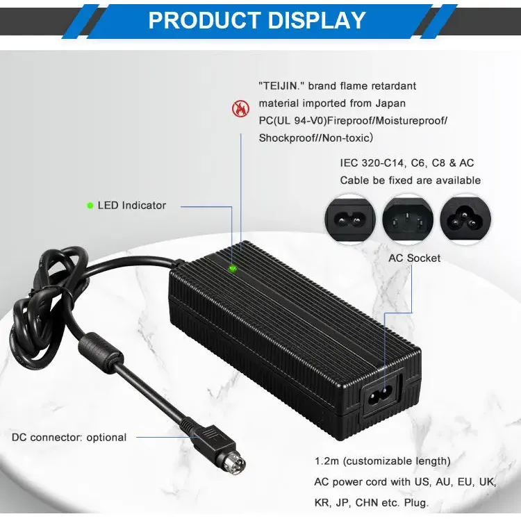 Global Compatibility at Flexible na Disenyo: Binuo gamit ang universal AC input range na 100–240VAC, 50/60Hz, sinusuportahan ng charger na ito ang paggamit sa buong mundo. Nag-aalok ito ng maraming opsyon sa inlet ng AC (IEC320-C14, C6, C8) at may kasamang 1.2M power cord na maaaring i-customize sa US, AU, EU, UK, KR, JP, CHN, at iba pang regional plugs. Ang pabahay ay ginawa mula sa PC na hindi masusunog na materyal, na tinitiyak ang tibay at kaligtasan sa ilalim ng iba't ibang mga kondisyon sa pagpapatakbo.