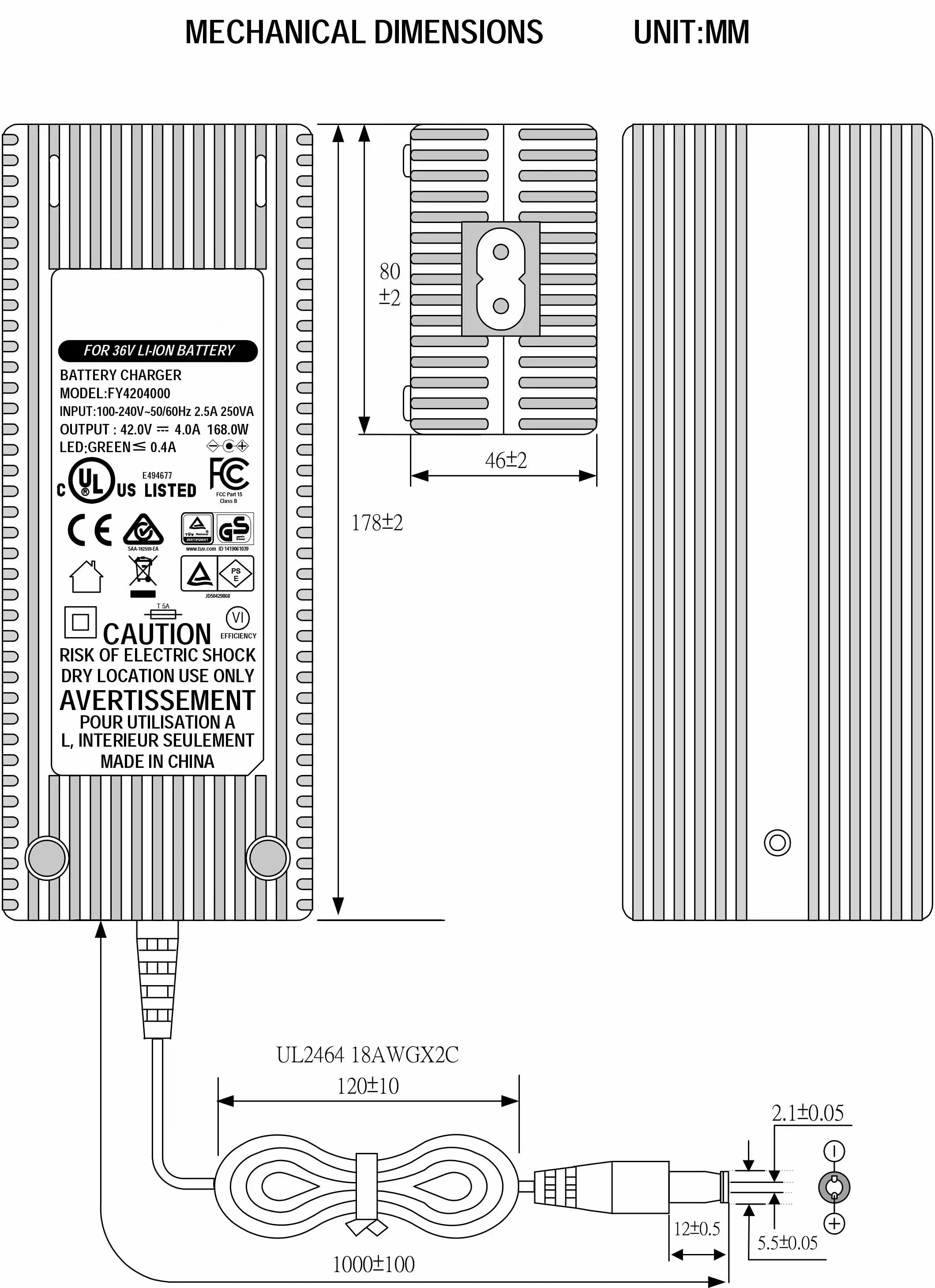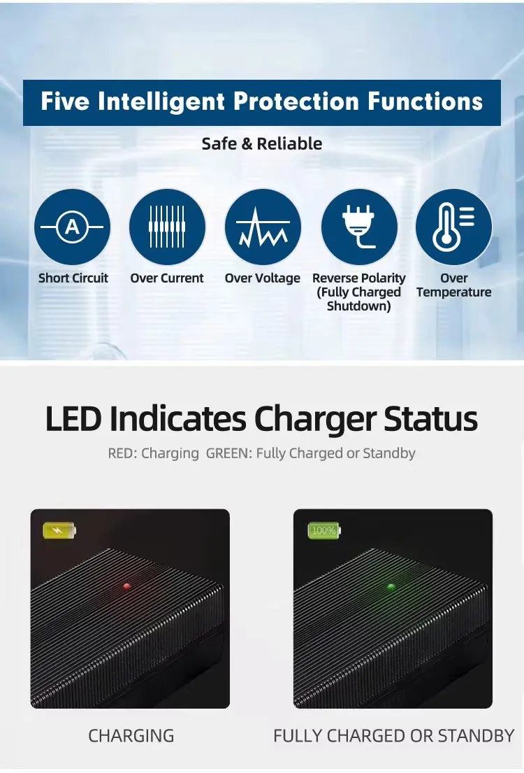 Komprehensibong Proteksyon at Sertipikasyon: Ang kaligtasan ay higit sa lahat. Nagtatampok ang 42V 4A Scooter Battery Charger ng mga mahusay na mekanismo ng proteksyon kabilang ang short circuit, overvoltage, overtemperature, at overload na proteksyon, na may HIPOT testing hanggang 4200V para sa karagdagang kaligtasan ng insulation. Gumagana ito nang mahusay sa >89% na kahusayan at nagdadala ng malawak na listahan ng mga pandaigdigang certification: UL, CUL, GS, CE, BS, SAA, KC, PSE, CB, FCC, EMC, ROHS, at REACH, na sumusunod sa mga pamantayan sa kaligtasan gaya ng UL60950, IEC60950, at IEC60335.
