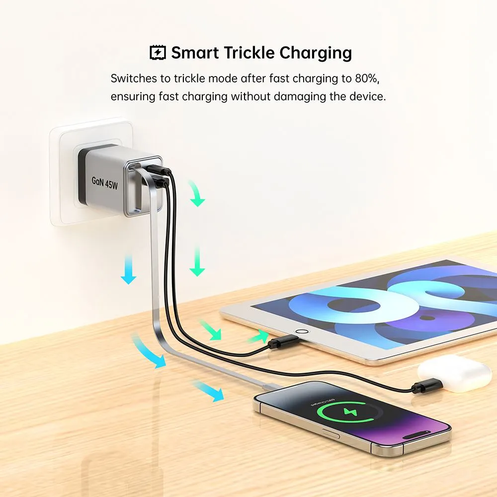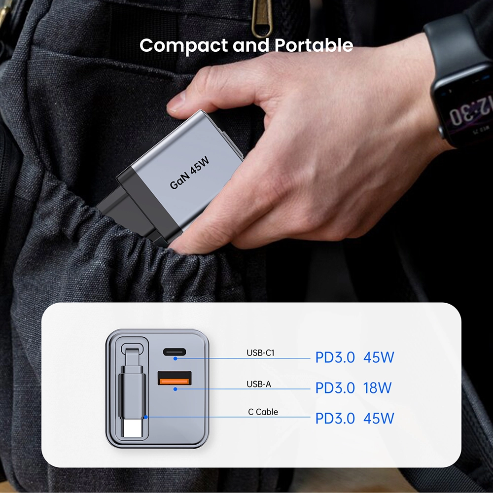 Mataas na bilis ng pagsingil: Ang GaN 45W Retractable Fast Charger ay ipinagmamalaki ang isang malakas na output ng 45 watts, tinitiyak ang mabilis na singilin para sa iyong mga aparato.