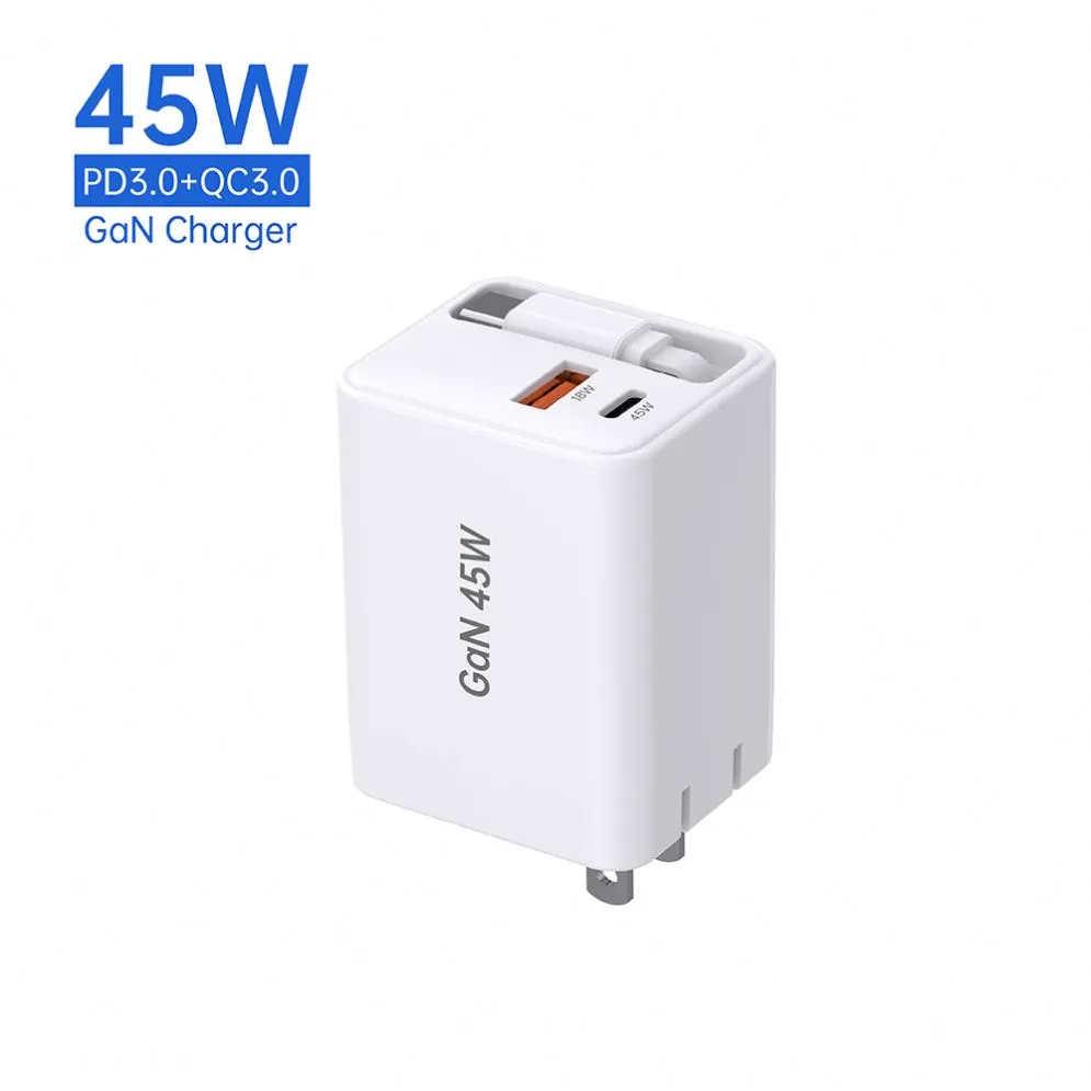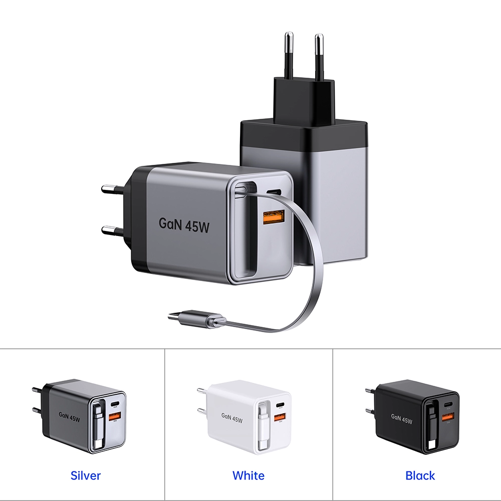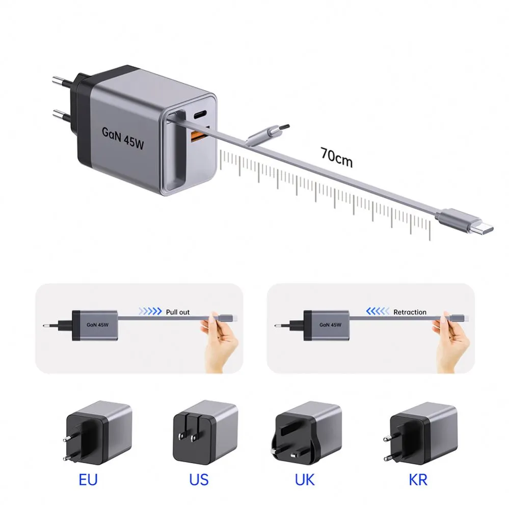 GaN 45W Retractable Fast Charger USB-Cable+USB-A+USB-C 45W PD Charger na may cable