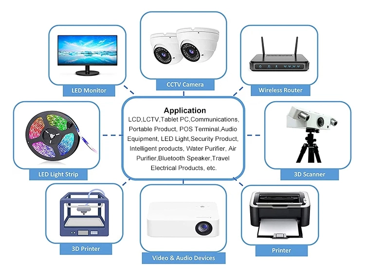* Higit pang mga unit para sa 48W series: 5V/9V/12V/15V/19V/24V/36V/48V available * Kaligtasan: OCP/OVP/OTP, SCP, awtomatikong overload cut-off, over Voltage cut-off, awtomatikong thermal cut-off. * Malawak na compatibility: LED Strip Lights, 3D Printer, ham radio transceiver, CCTV camera, car subwoofer amp, audio amplifier, wireless router, ADSL Cats, Humidifier, HUB, Keyboard, BT Speaker, Monitor, Webcam, DVR, NVR, audio/video power supply