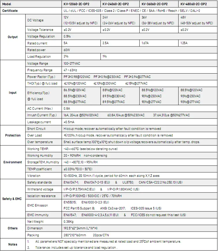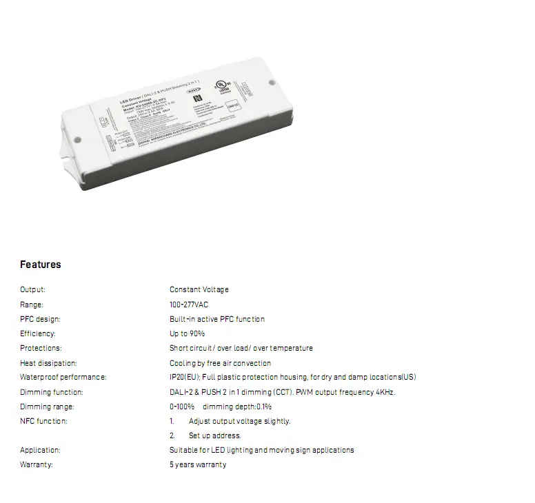 Gumagamit ng DALI digital dimming, sinusuportahan nito ang 0.1%-100% smooth flicker-free dimming at tumpak na pagsasaayos ng CCT mula 2700K hanggang 6500K, na pinananatiling pare-pareho ang liwanag sa panahon ng pagbabago ng temperatura ng kulay. Ang built-in na aktibong PFC ay nagpapalakas ng kahusayan hanggang sa 88%, na may mababang paggamit ng kuryente na walang load. Nagtatampok ito ng soft start, overvoltage, overcurrent at short-circuit na proteksyon, na tinitiyak ang ligtas na operasyon.