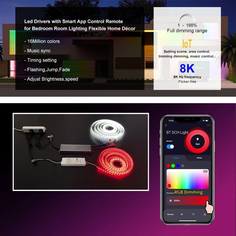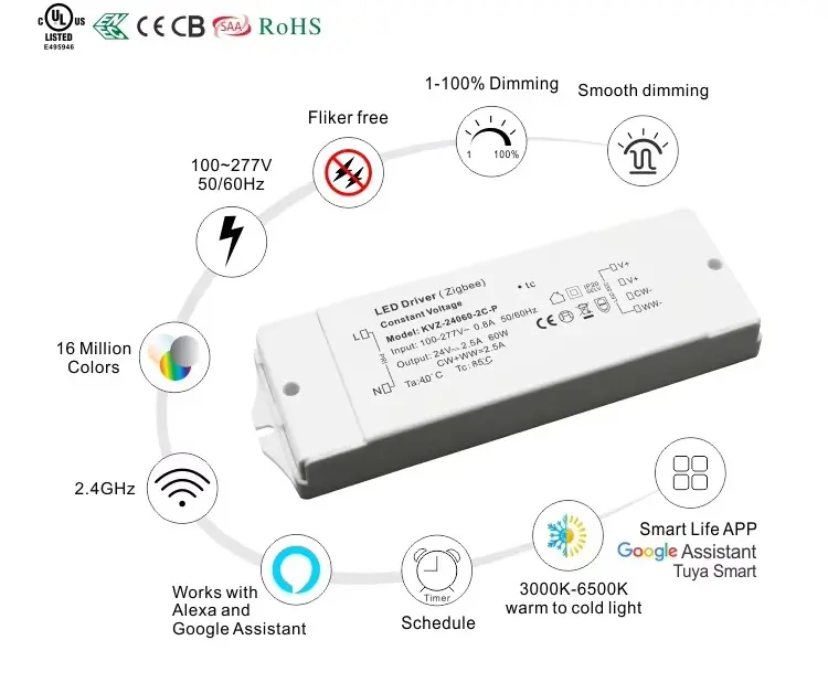 Smart Dimming sa Iyong mga daliri Nagtatampok ng pinagsamang ZigBee wireless module na may teknolohiyang TUYA, nag-aalok ang driver na ito ng walang putol na smart control. Isaayos ang liwanag sa pamamagitan ng mobile app o mga voice command sa pamamagitan ng Google Home at Amazon Echo. Tinitiyak ng high-frequency na 8K Hz PWM na output ang ganap na flicker-free dimming, habang ang 1-100% dimming range na may 1% depth ay nagbibigay-daan para sa maayos na mga transition at perpektong paglikha ng ambiance.