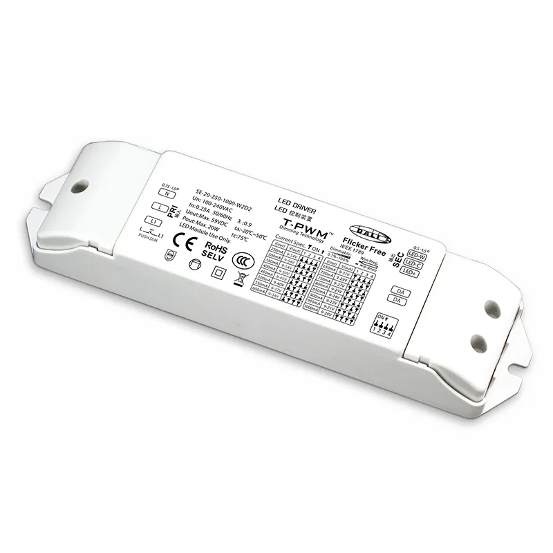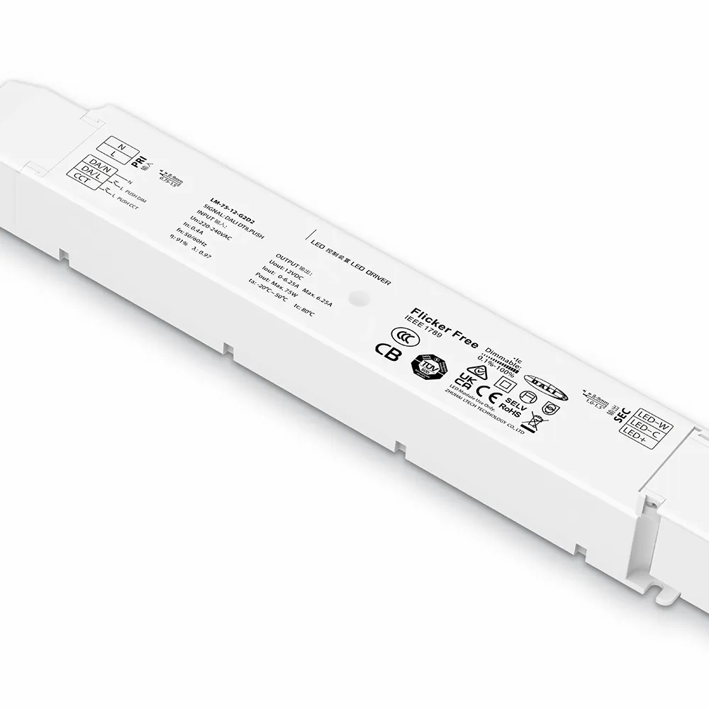 Nagtatampok ang DALI LED driver na ito ng pare-parehong boltahe na output na 12V ±2%, na nagbibigay ng pare-parehong pag-iilaw nang walang kurap. Tumatanggap ito ng unibersal na saklaw ng boltahe ng input na 100–240V AC, na ginagawa itong angkop para sa pandaigdigang paggamit. Ang aparato ay gumagana nang may mataas na kahusayan ng hanggang sa 90%, na binabawasan ang pag-aaksaya ng enerhiya at pagbuo ng init. Kabilang dito ang buong proteksyon laban sa mga short circuit, overload, over-voltage, at over-temperature. Sa isang matibay na pabahay na metal at isang IP65 na rating, ito ay protektado laban sa alikabok at mga jet ng tubig, na tinitiyak ang maaasahang pagganap sa parehong panloob at panlabas na kapaligiran (saklaw ng temperatura ng pagpapatakbo: -20°C hanggang +50°C). Sinusuportahan ng DALI interface ang dimming mula 0.1% hanggang 100% nang walang naririnig na ingay, na nagbibigay-daan sa maayos at nababaluktot na pagsasaayos ng liwanag.