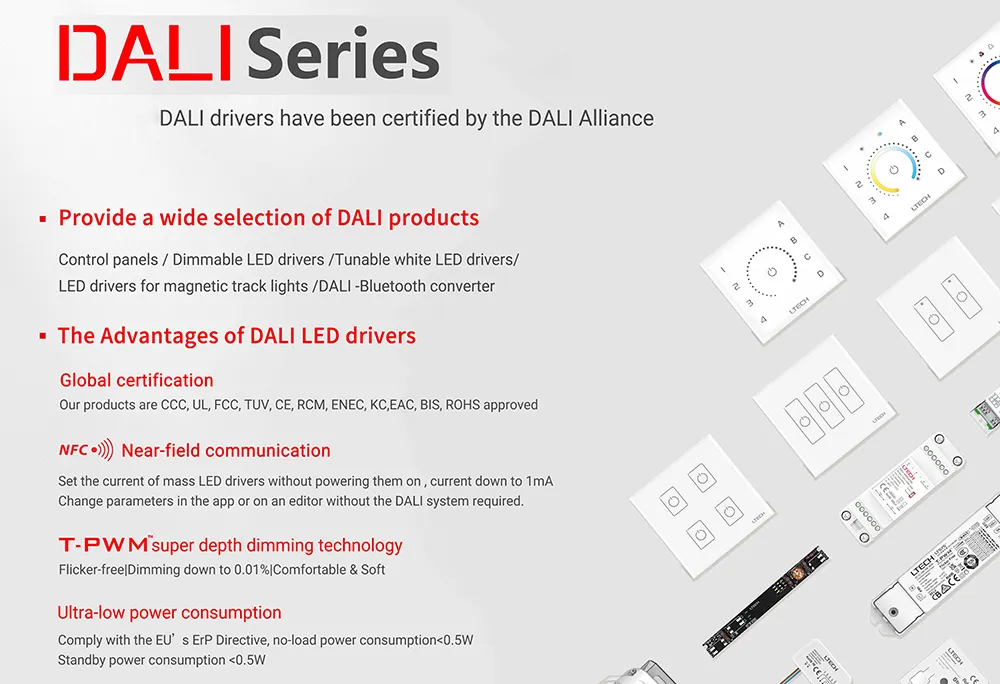 Advanced na DALI Dimming Control – Pinapagana ang digital dimming mula 0.1% hanggang 100% na may mataas na resolution, na sumusuporta sa hanggang 64 na DALI address para sa indibidwal o grupong kontrol sa mga automated lighting system.