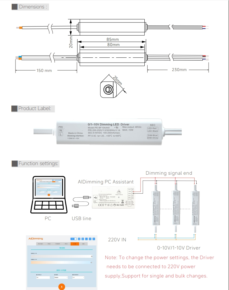 1. Bago i-access ang dimming signal, mangyaring kumpirmahin kung ang control signal ay 0-10V o 1-10V, at ang signal at kasalukuyang mga setting ay maaaring baguhin sa pamamagitan ng AIDimming PC at software. Ang power supply upang baguhin ang mga parameter ay dapat na konektado sa 220V power supply, na maaaring baguhin sa mga batch.