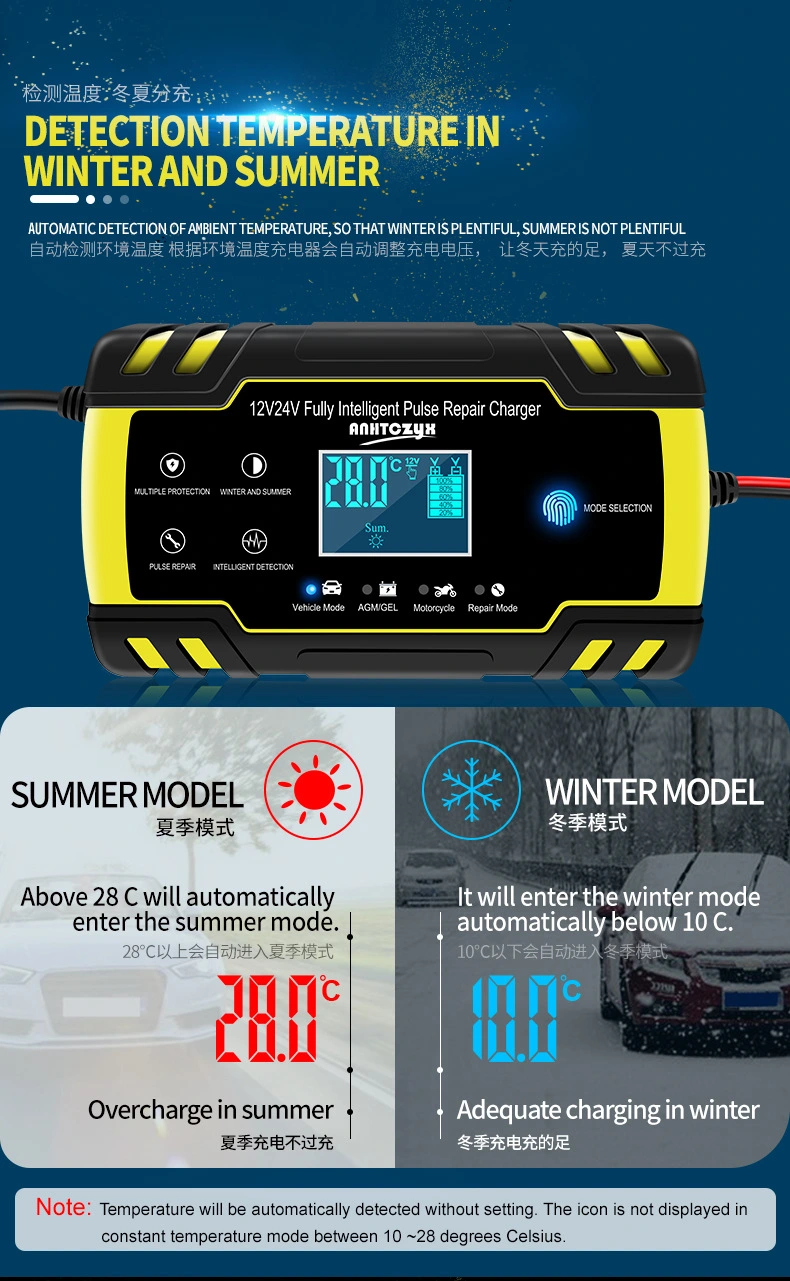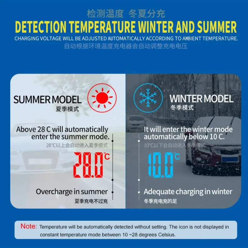 · Auto Maintenance Mode: Gumagana bilang isang trickle charger at pangmatagalang tagapanatili ng baterya, perpekto para sa pana-panahon o hindi madalas na ginagamit na mga sasakyan.