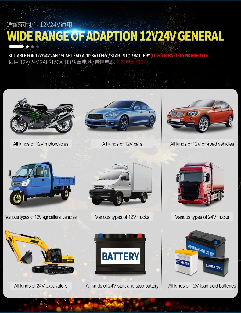 Ang J30 intelligent battery charger ay partikular na idinisenyo para sa mga modernong start-stop na sasakyan at tradisyonal na lead-acid na baterya. Ito ay ganap na tugma sa AGM, EFB, GEL, at mga ordinaryong flooded lead-acid na baterya, at angkop para sa 12V (8A) at 24V (4A) system. Maaari itong ligtas na magamit sa iba't ibang mga sitwasyon tulad ng mga kotse, motorsiklo, trak, at yate.