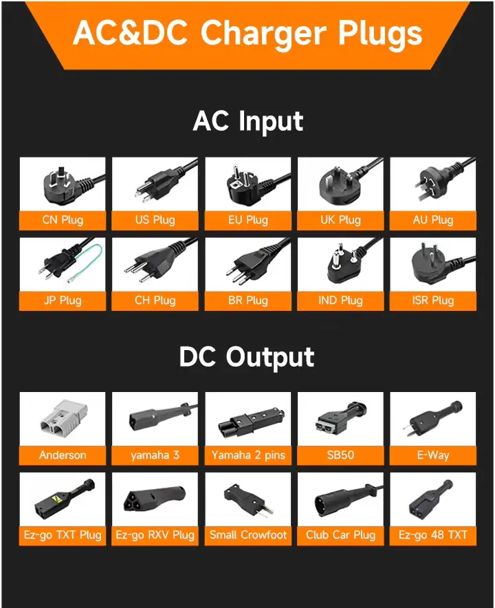 Ang EU plug, kadalasan para sa mga bansang EU tulad ng Germany, France, Netherlands, Denmark, Austria, Sweden, atbp. Ang UK plug, kadalasan para sa Britain, India, Pakistan, Singapore at iba pa. Ang AU plug, kadalasan para sa Australia, New Zealand, Argentina at iba pa. Ang karaniwang mga konektor ng DC sa merkado ay kinabibilangan ng Anderson, EZ-go, DS Club Car at Yamaha Connector, atbp.