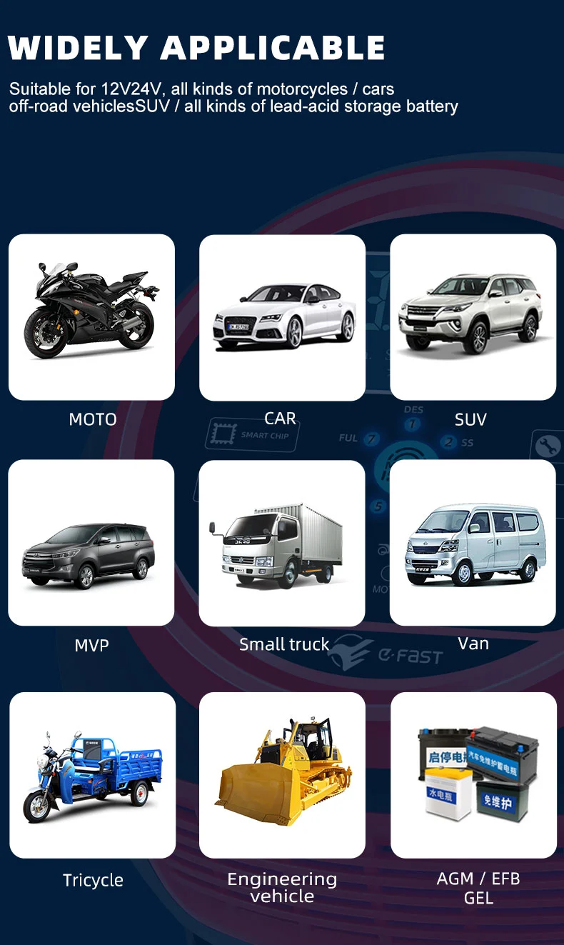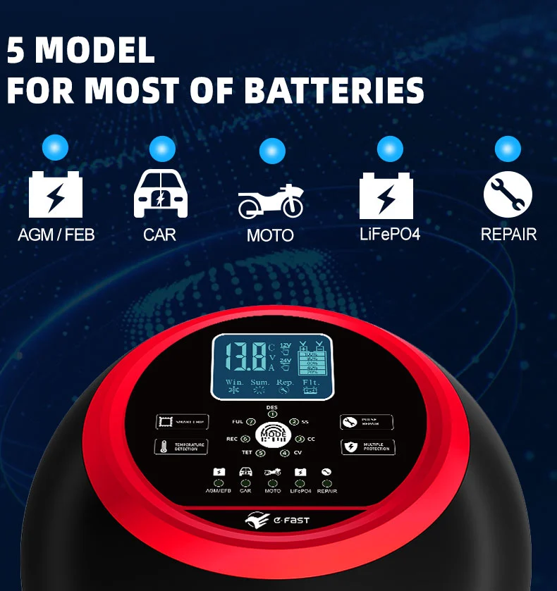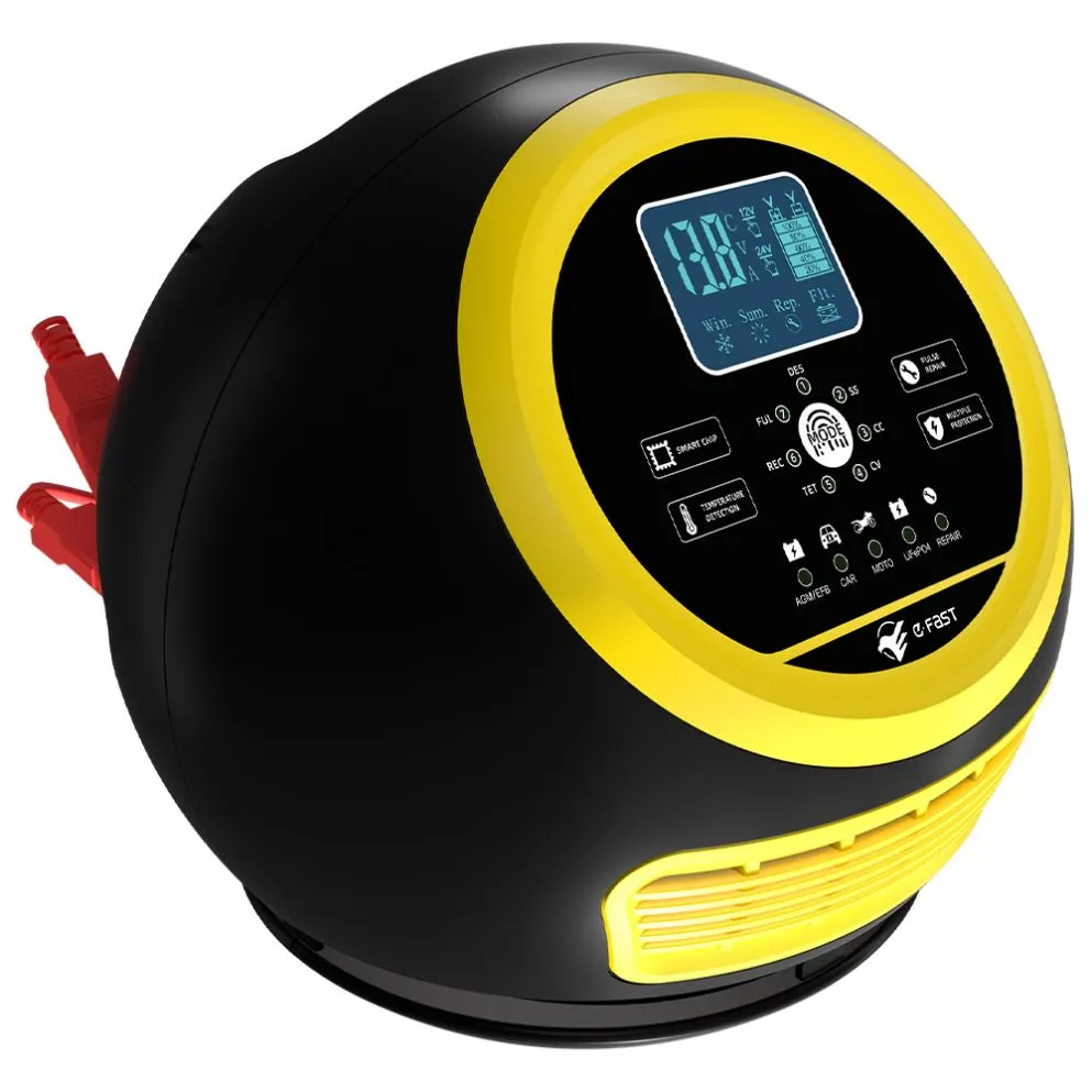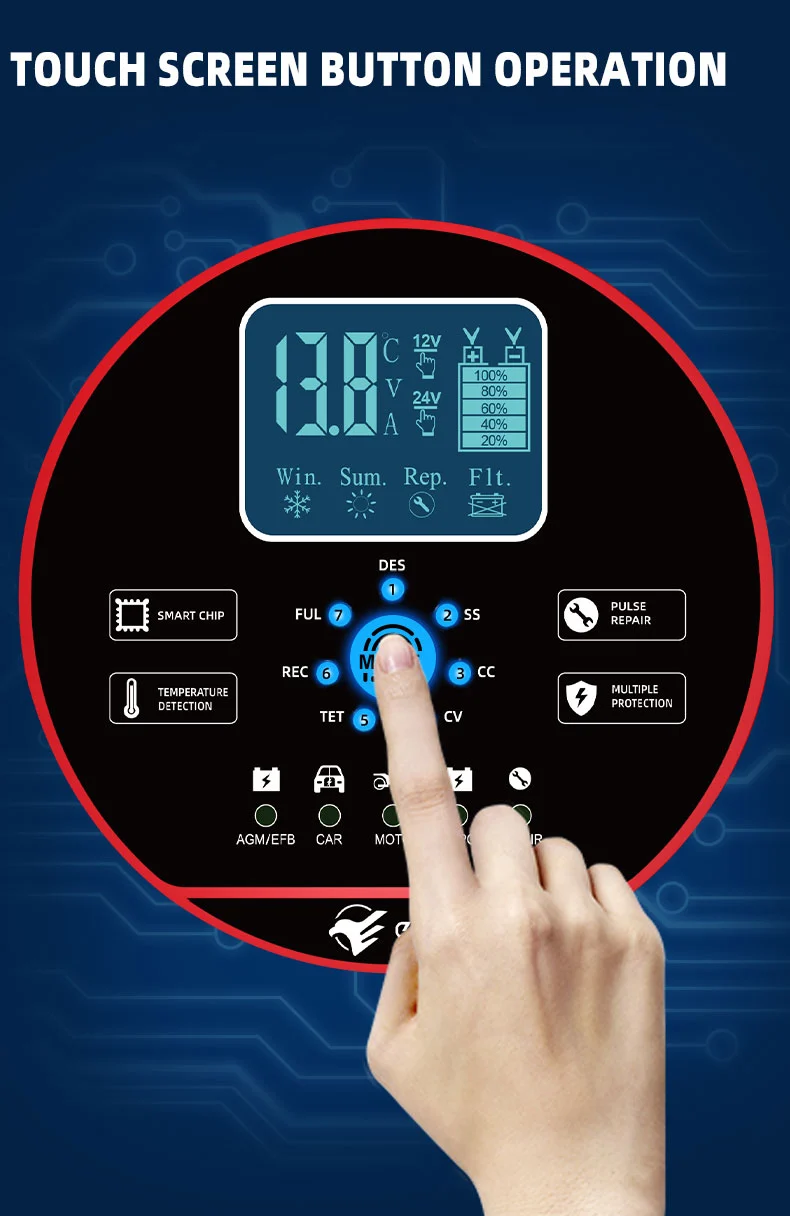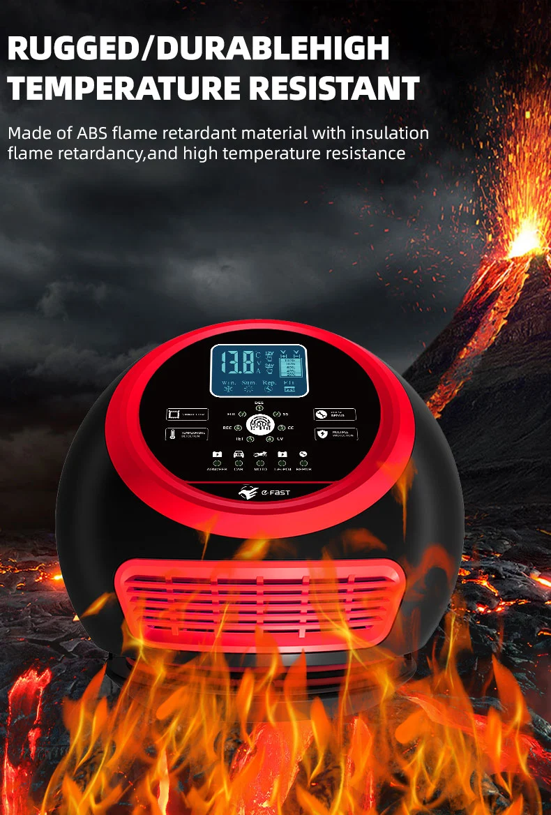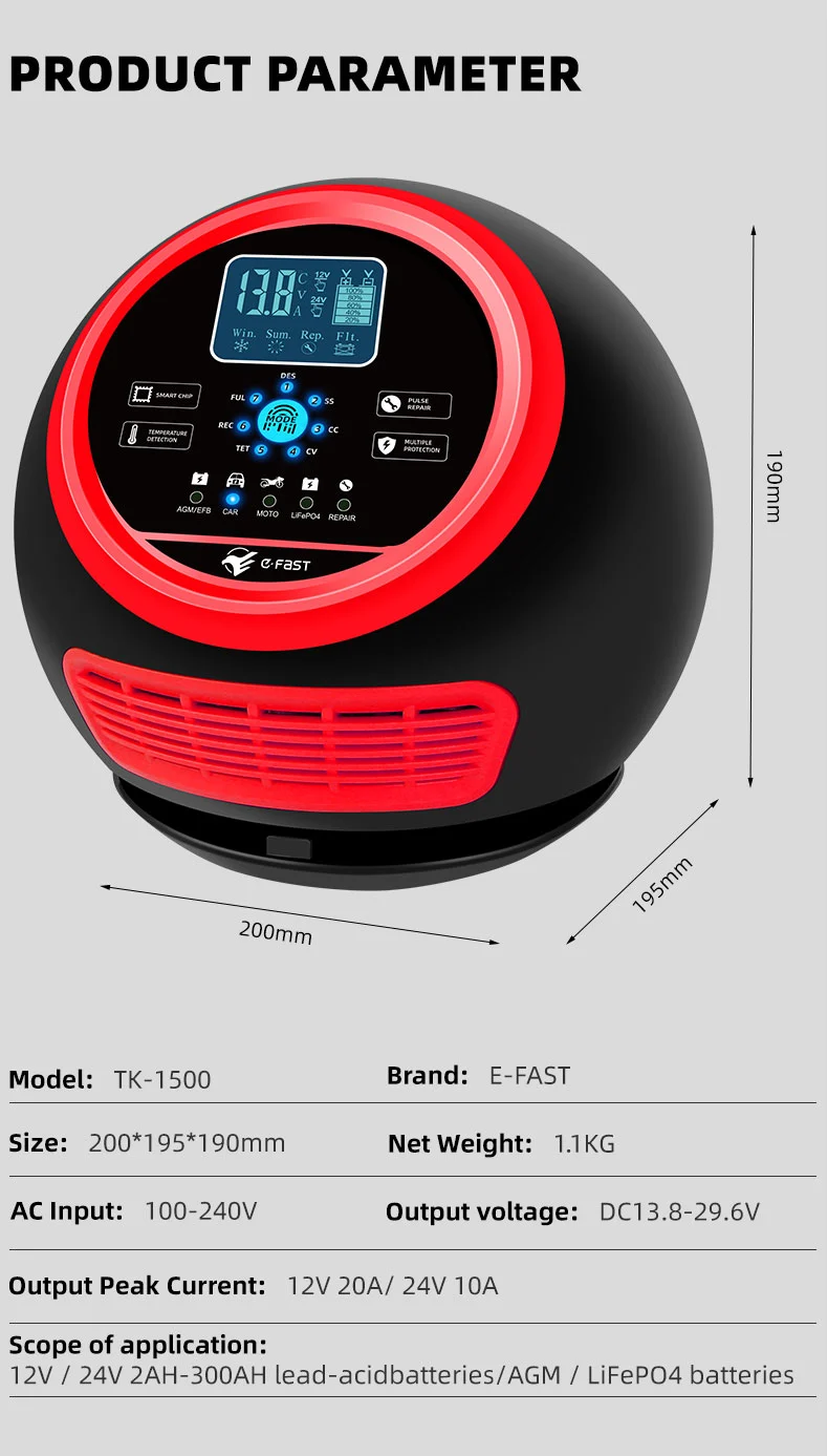 Nagtatampok ang charger na ito ng isang makabagong compact na disenyo at nilagyan ng high-definition na LCD display na nagpapakita ng boltahe, kasalukuyang, temperatura, pag-unlad ng pag-charge at katayuan ng baterya sa real time, na ginagawang malinaw ang operasyon sa isang sulyap. Mayroon itong inbuilt pulse repair function na maaaring mag-activate at mag-repair ng mga lumang baterya, na nagpapahaba ng kanilang habang-buhay. Bilang isang ganap na awtomatikong intelligent na charger, sinusuportahan ng TK-1500 ang "plug and forget" na operasyon: awtomatiko nitong nade-detect ang boltahe ng baterya, pinipili ang charging mode, at lumipat sa float charging maintenance mode pagkatapos ng full charge para maiwasan ang overcharging. Ito ay mainam para sa pagpapanatili ng baterya ng mga sasakyan na nakaparada nang matagal o pana-panahong kagamitan tulad ng mga lawn mower at bangka.
