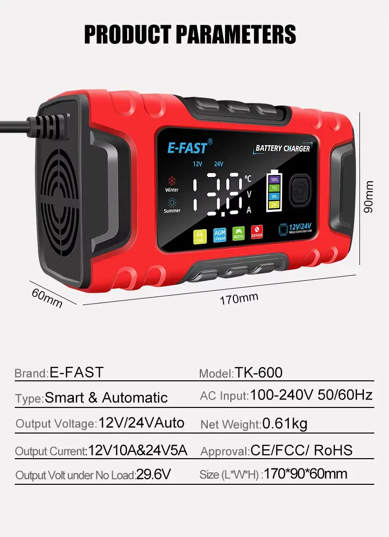 Mataas na Kalidad na E-Fast TK-600 na ganap na awtomatiko sa Pulse Repair Technology 12V10A 24V5A lead acid lifepo4 na charger ng baterya para sa kotse |