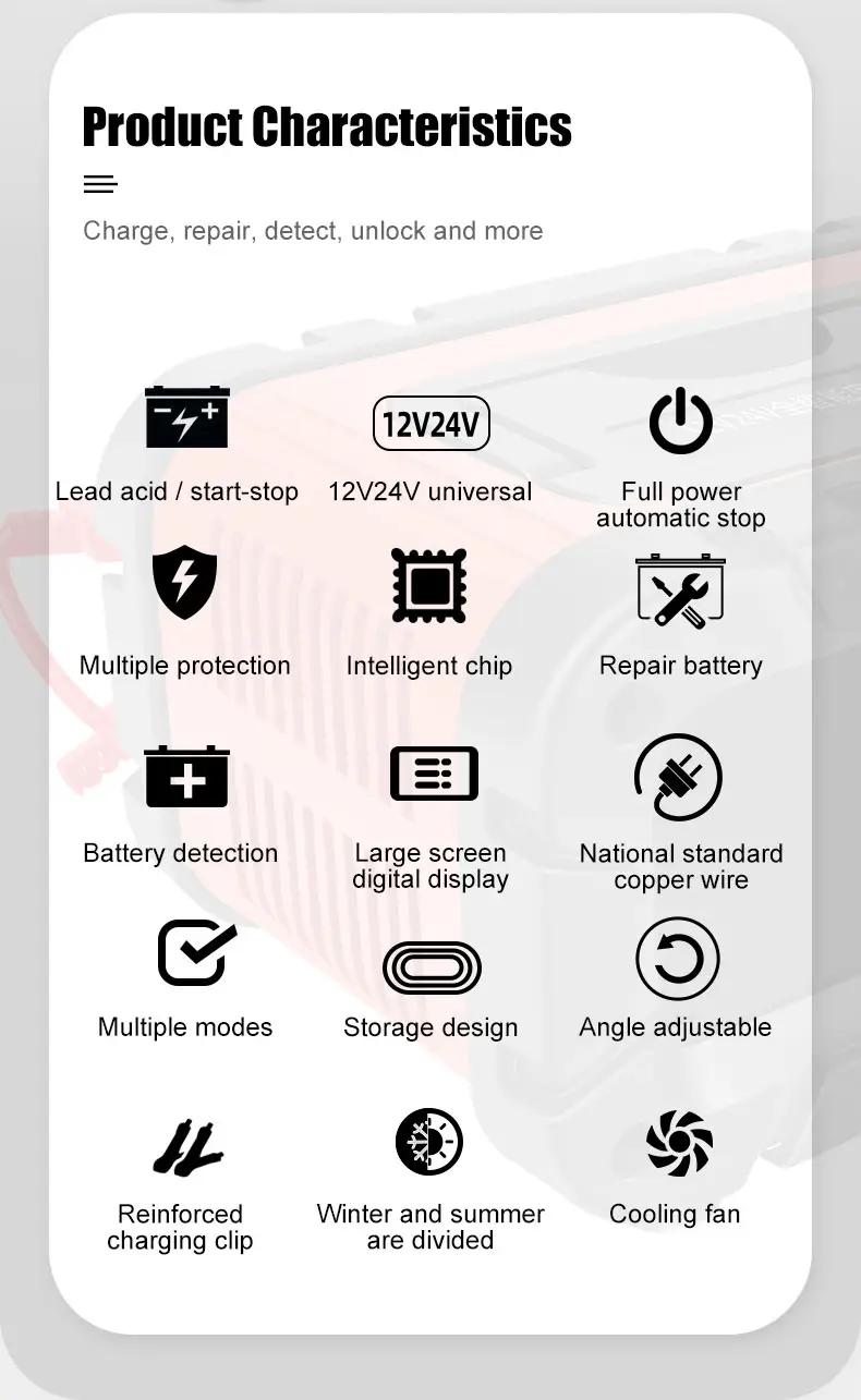 Maaaring buhayin ng built-in na recovery mode ang mga baterya hanggang 0V, na ginagawang lubos na epektibo ang TK700 Universal 12V 24V Lead Acid Battery Charger para sa pag-restore ng mga hindi aktibo o lumang baterya.