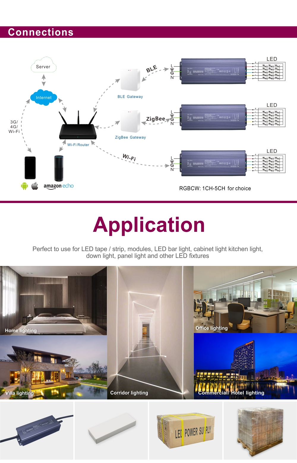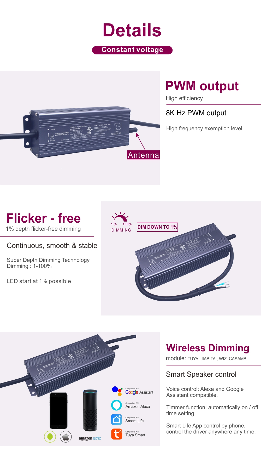 Malalim na isinama sa Tuya Smart ecosystem, ang Tuya Zigbee Wireless Dimming Constant Voltage 120W LED Driver na ito ay gumagamit ng pinakabagong Zigbee 3.0 communication protocol para sa seamless, two-way na komunikasyon.